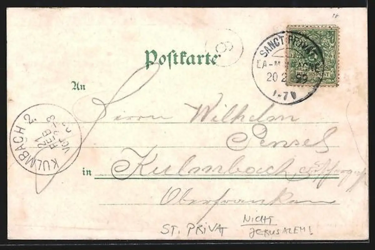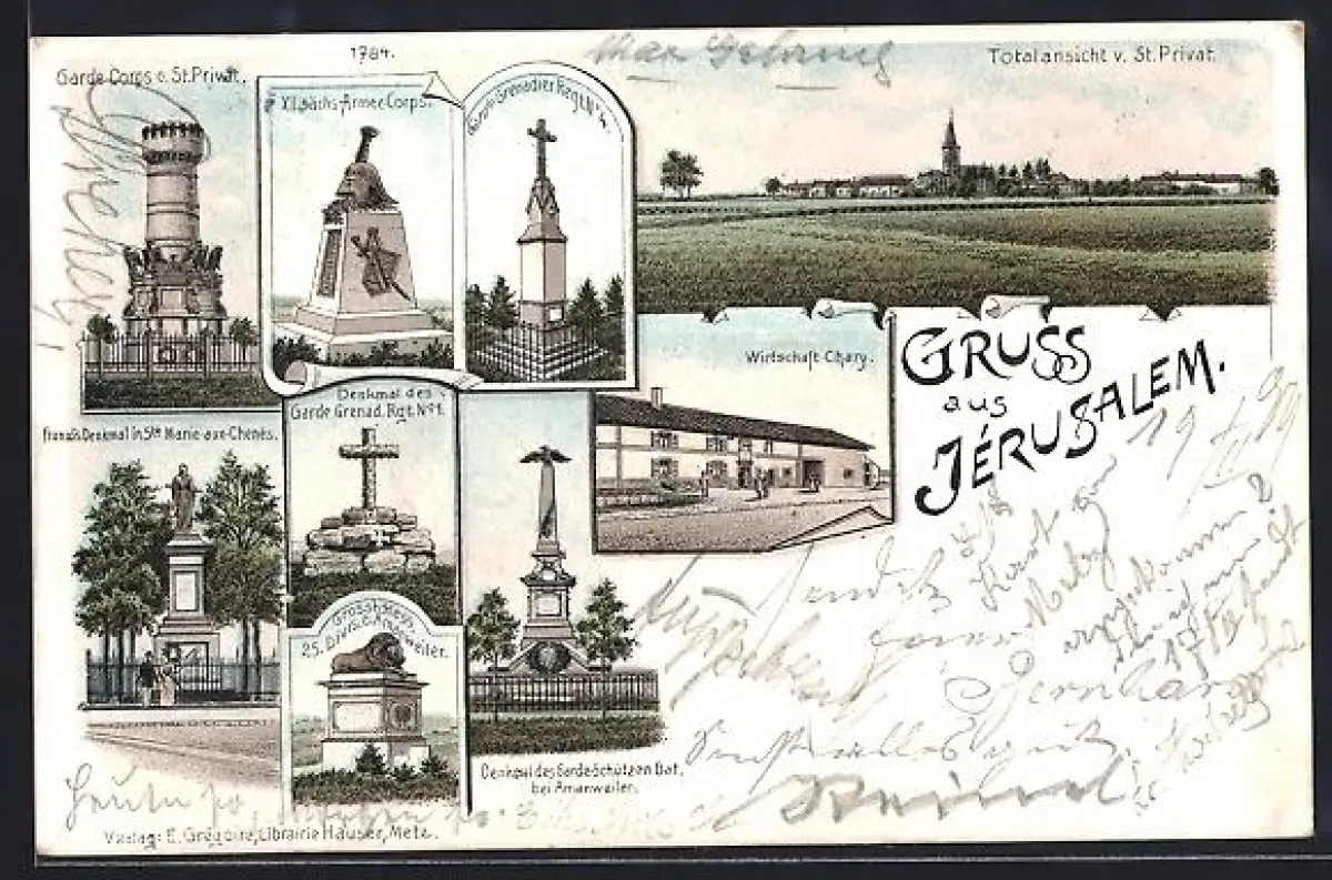 Lithographie St. Privat, Gasthof Chary, Kriegerdenkmäler, Ortsansicht mit Kirche