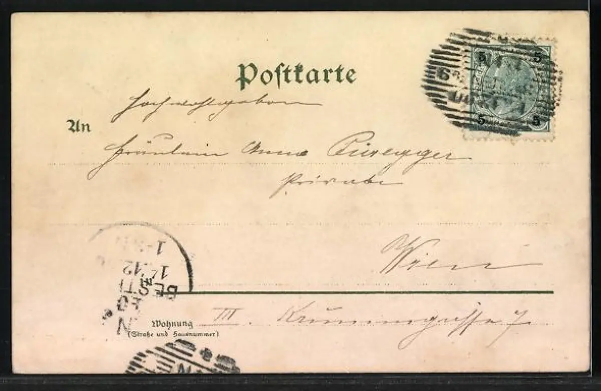 Personenbezogene Daten auf der Rückseite der Karte wurden durch blauen Textmarker unkenntlich gemacht. Die blauen Stellen sind auf die Vorderseite durchgeweicht und wirken sich negativ auf das Postkartenfoto aus