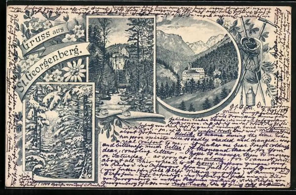 Lithographie Stans, Kloster St. Georgenberg, Bergsteiger-Ausrüstung