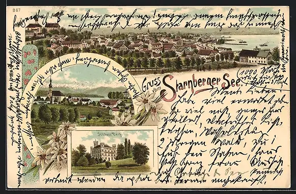 Lithographie Starnberg /Starnberger See, Teilansicht, Schloss Berg, Ortspartie