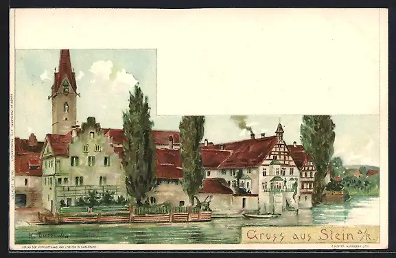 Lithographie Stein a. R., Häuser am Fluss-Ufer