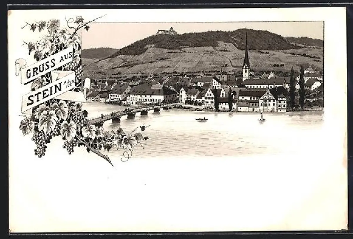Lithographie Stein a. Rh., Rheinpartie mit Blick auf den Ort