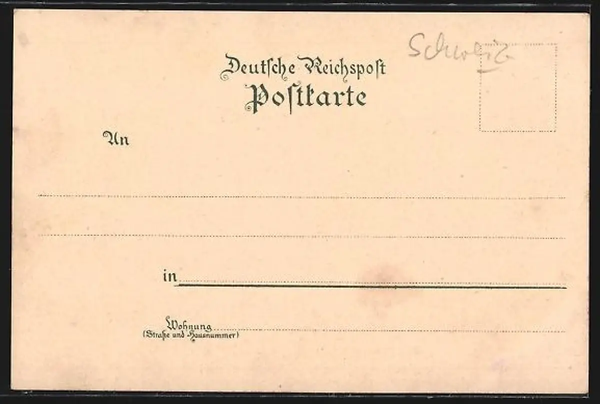 Personenbezogene Daten auf der Rückseite der Karte wurden durch blauen Textmarker unkenntlich gemacht. Die blauen Stellen sind auf die Vorderseite durchgeweicht und wirken sich negativ auf das Postkartenfoto aus