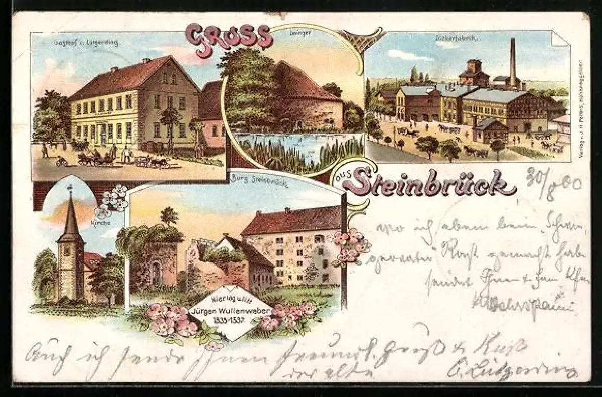 Lithographie Steinbrück / Söhlde, Gasthof Lütgerding, Burg Steinbrück, Zuckerfabrik, Zwinger, Kirche