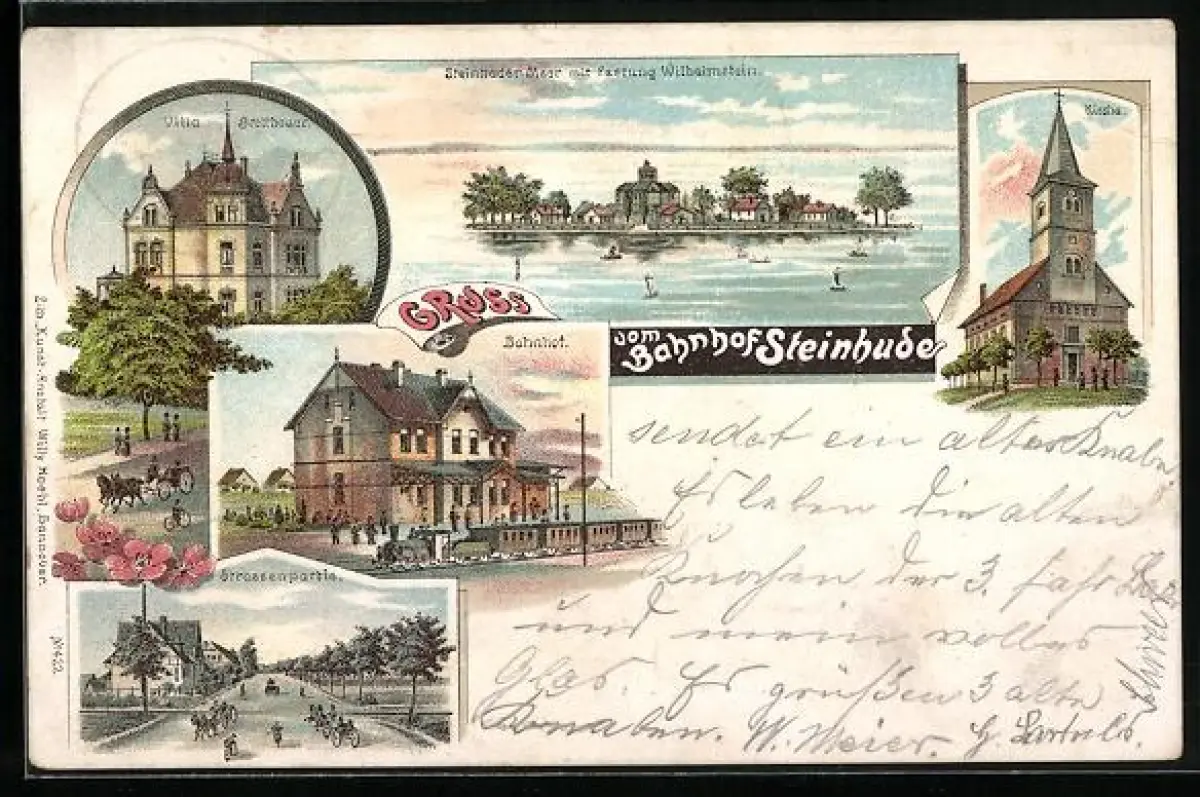 Lithographie Steinhude, Kirche, Villa Bretthauer, Bahnhof, Strassenpartie