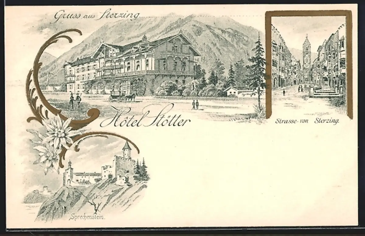 Lithographie Sterzing, Hotel Stötter, Strasse von Sterzing, Sprechenstein