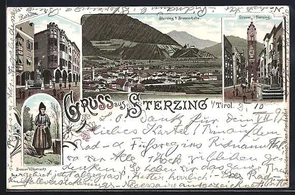 Lithographie Sterzing a. Brennerbahn, Rathaus, Strasse mit Tor und Denkmal, Brenner Volkstracht
