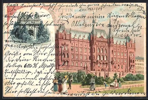 Lithographie Stettin, Rathaus mit Park, Königstor