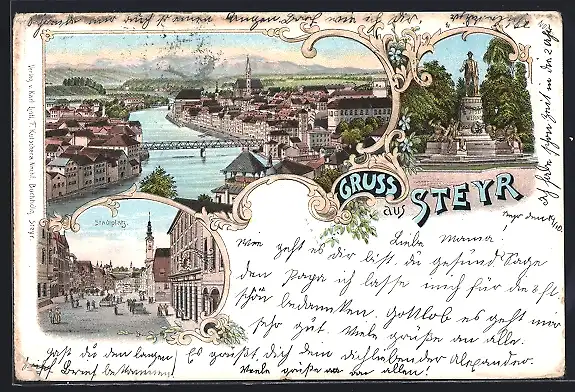 Lithographie Steyr, Strassenpartie am Stadtplatz, Denkmal Josef Werndl, Ortsansicht
