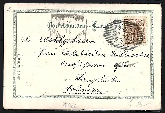 Personenbezogene Daten auf der Rückseite der Karte wurden durch blauen Textmarker unkenntlich gemacht. Die blauen Stellen sind auf die Vorderseite durchgeweicht und wirken sich negativ auf das Postkartenfoto aus
