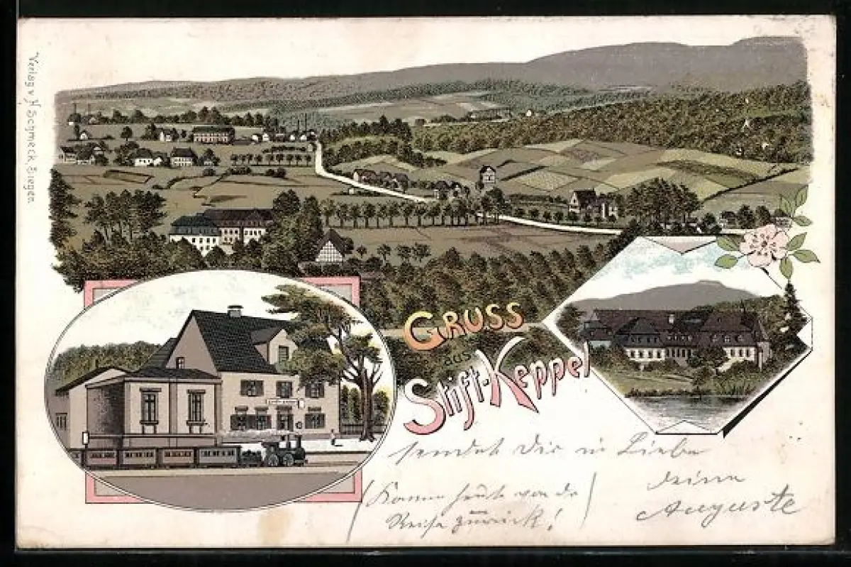 Lithographie Stift-Keppel, Totalansicht, Bahnhof und Villen