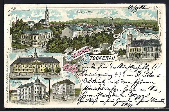 Lithographie Stockerau, Rathhaus, Convict und Schlössl