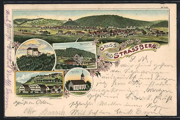 Lithographie Strassberg / Hohenzollern, Bahnhof, Ott`sche Tricot-Fabrik, Brauerei z. Zollern, Kirche und Totalansicht
