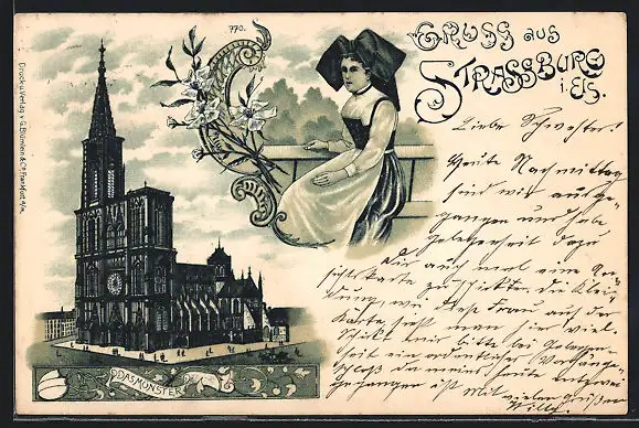 Lithographie Strassburg, Blick auf das Münster, Frau in Tracht
