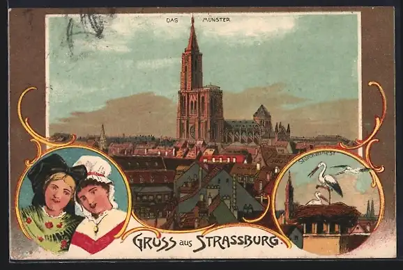 Lithographie Strassburg, Blick zum Münster, Elsässerinnen in Tracht
