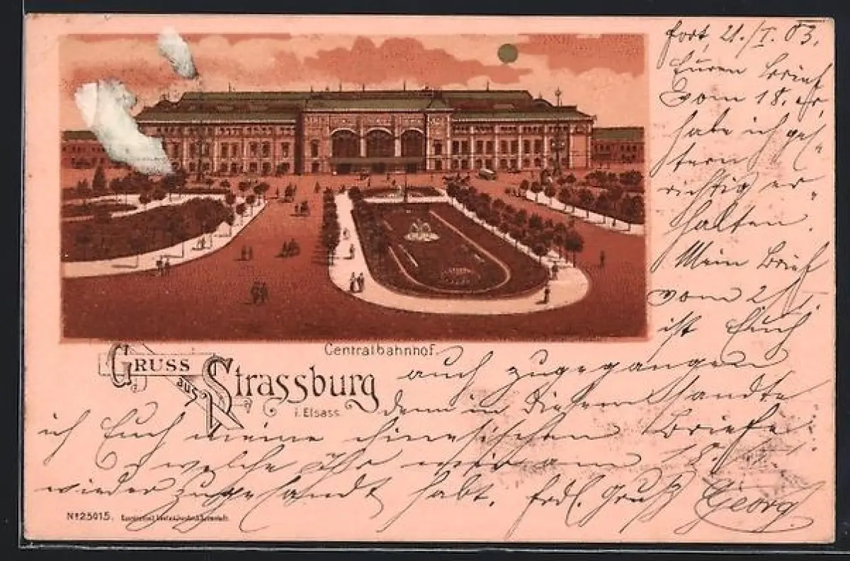 Lithographie Strassburg, Centralbahnhof mit Vorplatz