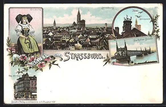 Lithographie Strassburg, Elsässerin in Tracht, Kehler Brücke, Gesamtansicht