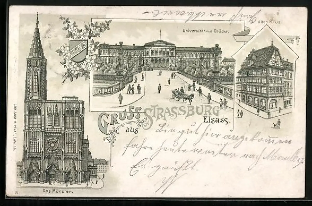 Lithographie Strassburg /Elsass, Münster, Universität mit Brücke, Altes Haus