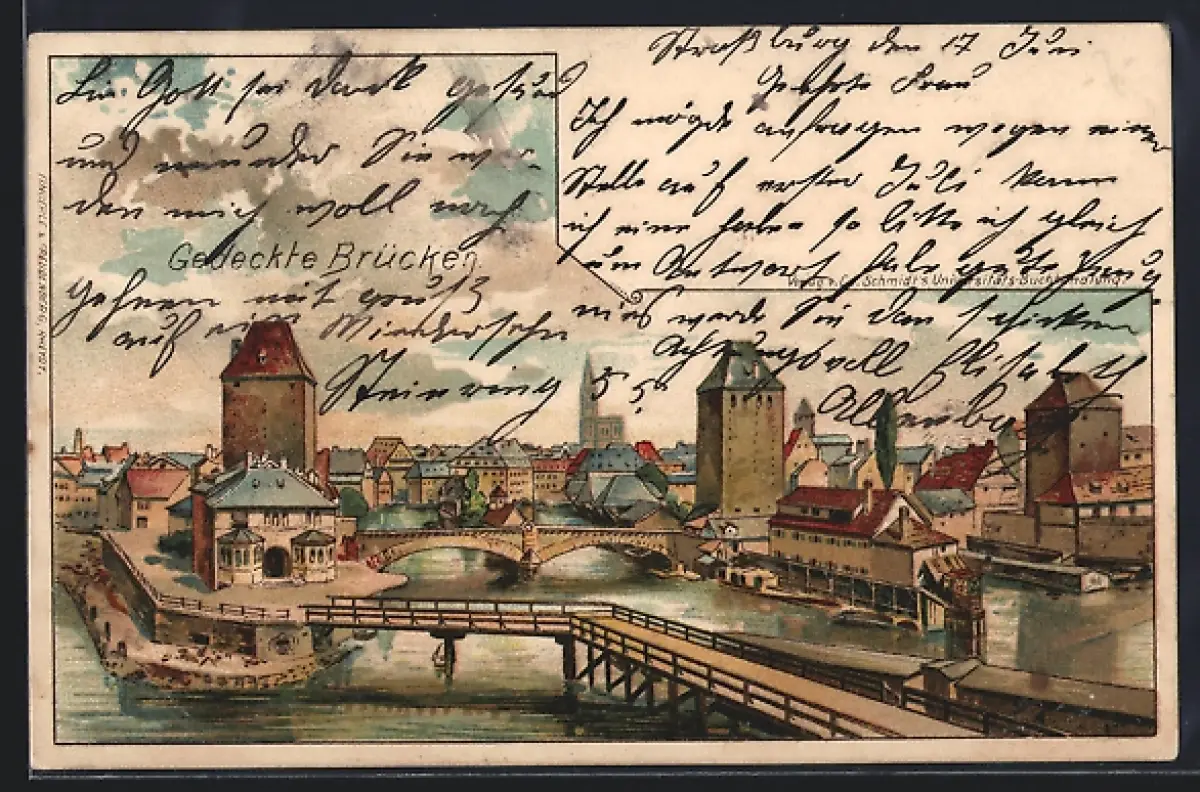 Lithographie Strassburg, Flusspartie mit gedeckten Brücken