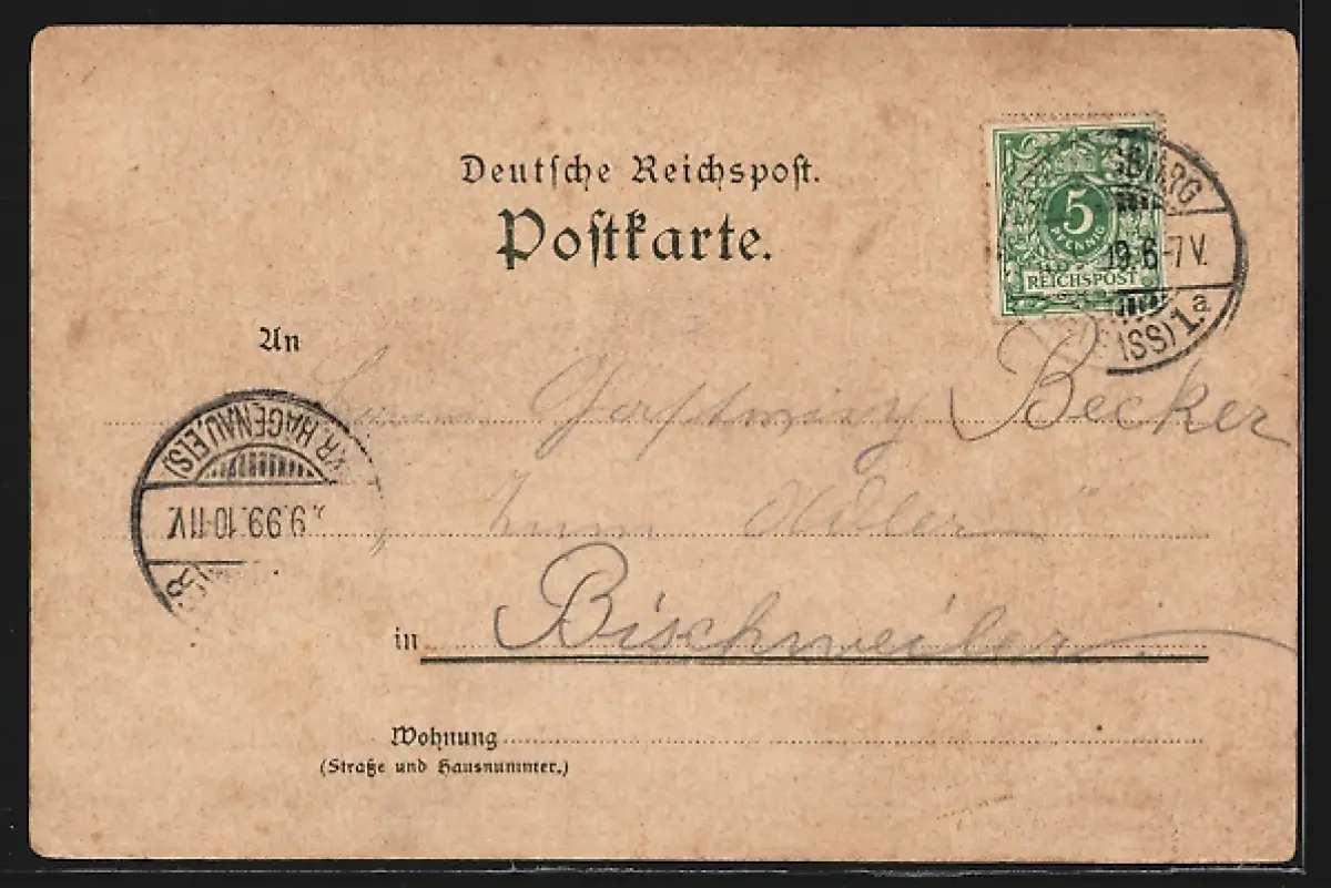 Personenbezogene Daten auf der Rückseite der Karte wurden durch blauen Textmarker unkenntlich gemacht. Die blauen Stellen sind auf die Vorderseite durchgeweicht und wirken sich negativ auf das Postkartenfoto aus