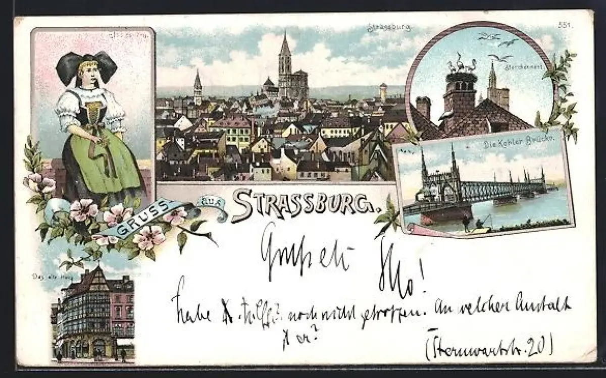 Lithographie Strassburg, Kehler Brücke, Elsässerin, Storchennest, Das alte Haus