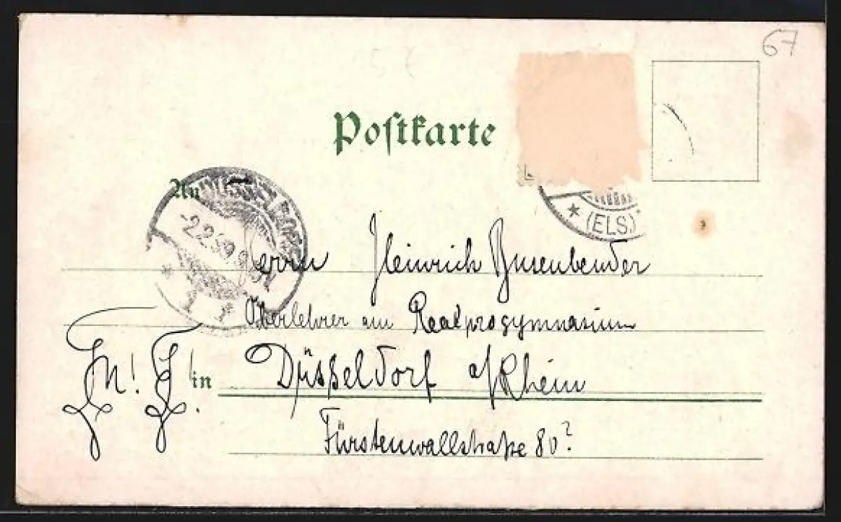 gelaufen 1899, Briefmarke entfernt, rückseitig Oberflächenschaden, Eckknick unten re., guter Zustand