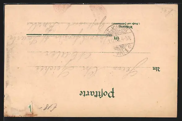 Personenbezogene Daten auf der Rückseite der Karte wurden durch blauen Textmarker unkenntlich gemacht. Die blauen Stellen sind auf die Vorderseite durchgeweicht und wirken sich negativ auf das Postkartenfoto aus