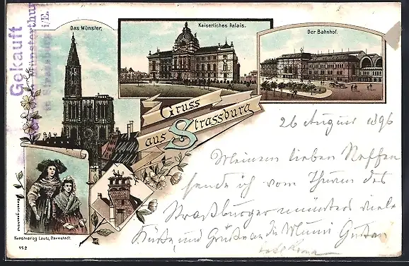 Lithographie Strassburg, Münster, Kaiserliches Palais, Bahnhof, Elsässerinnen in Tracht