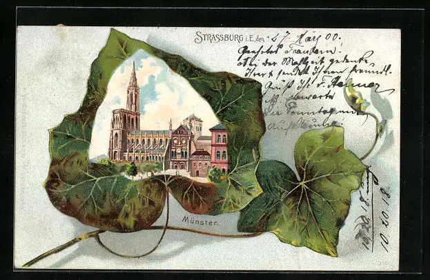 Lithographie Strassburg, Münster auf Efeublatt