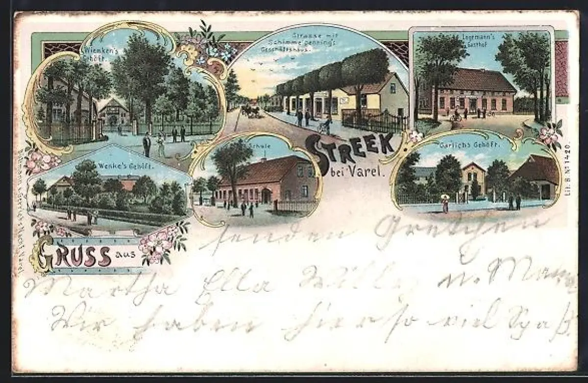 Lithographie Streek / Varel, Logemann`s Gasthof, Strassenpartie mit Schimmelpennig`s Geschäftshaus, Wenke`s Gehöft