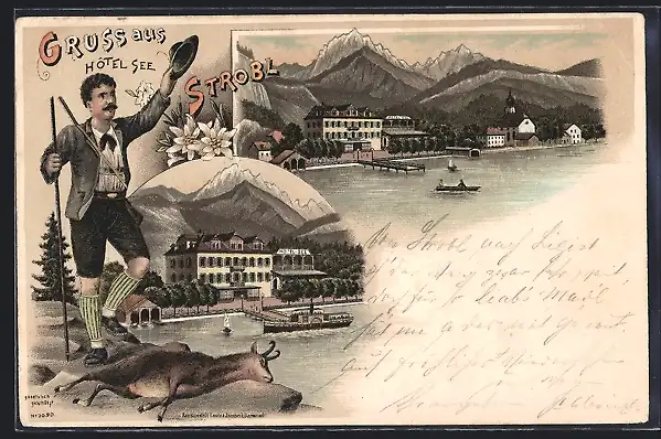 Lithographie Strobl, Jäger mit erlegter Gemse, Hotel See mit Alpen-Panorama