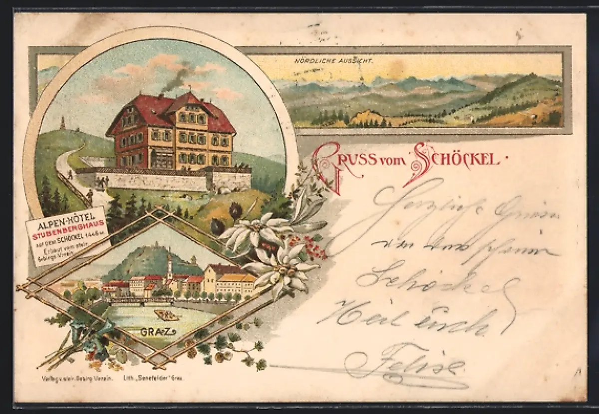 Lithographie Stubenberghaus, Alpen-Hotel auf dem Schöckel, Ortspartie aus Graz