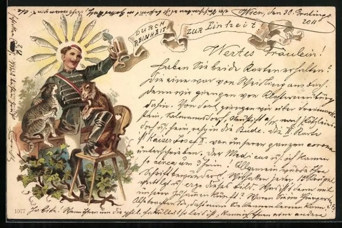 Lithographie Student im vollen Wix mit Bierkrug und Heiligenschein aus Heringen