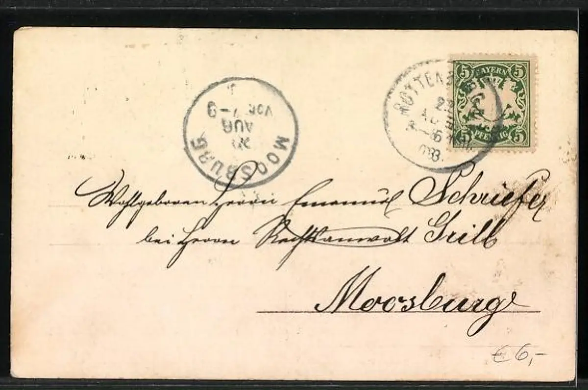 Personenbezogene Daten auf der Rückseite der Karte wurden durch blauen Textmarker unkenntlich gemacht. Die blauen Stellen sind auf die Vorderseite durchgeweicht und wirken sich negativ auf das Postkartenfoto aus