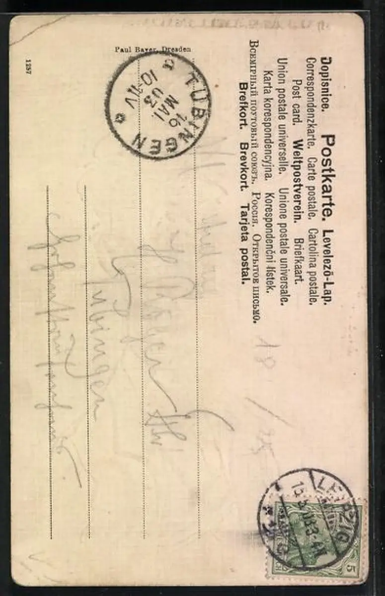 Personenbezogene Daten auf der Rückseite der Karte wurden durch blauen Textmarker unkenntlich gemacht. Die blauen Stellen sind auf die Vorderseite durchgeweicht und wirken sich negativ auf das Postkartenfoto aus