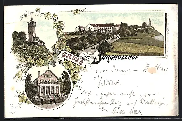 Lithographie Stuttgart, Gaststätte Burgholzhof, Gesamtansicht mit Landstrasse, Aussichtsturm