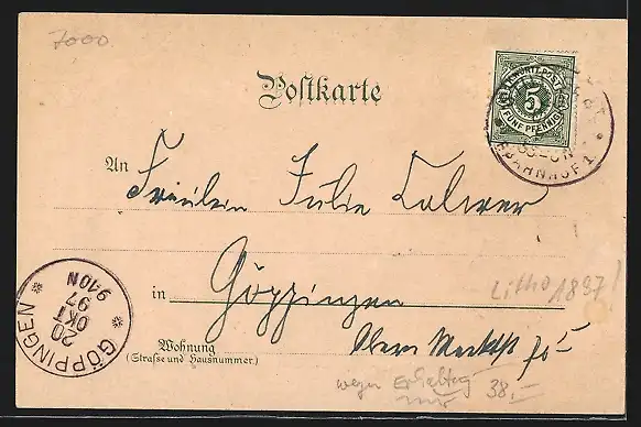 gelaufen 1897, Bugspuren obere Ecken, guter Zustand