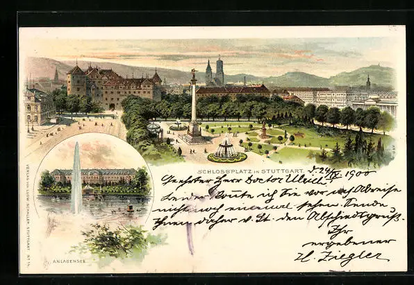 Lithographie Stuttgart, Schlossplatz aus der Vogelschau, Anlagensee