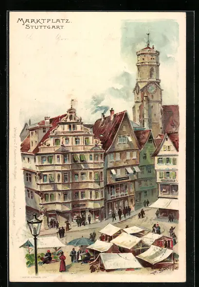 Lithographie Stuttgart, Strassenpartie am Marktplatz