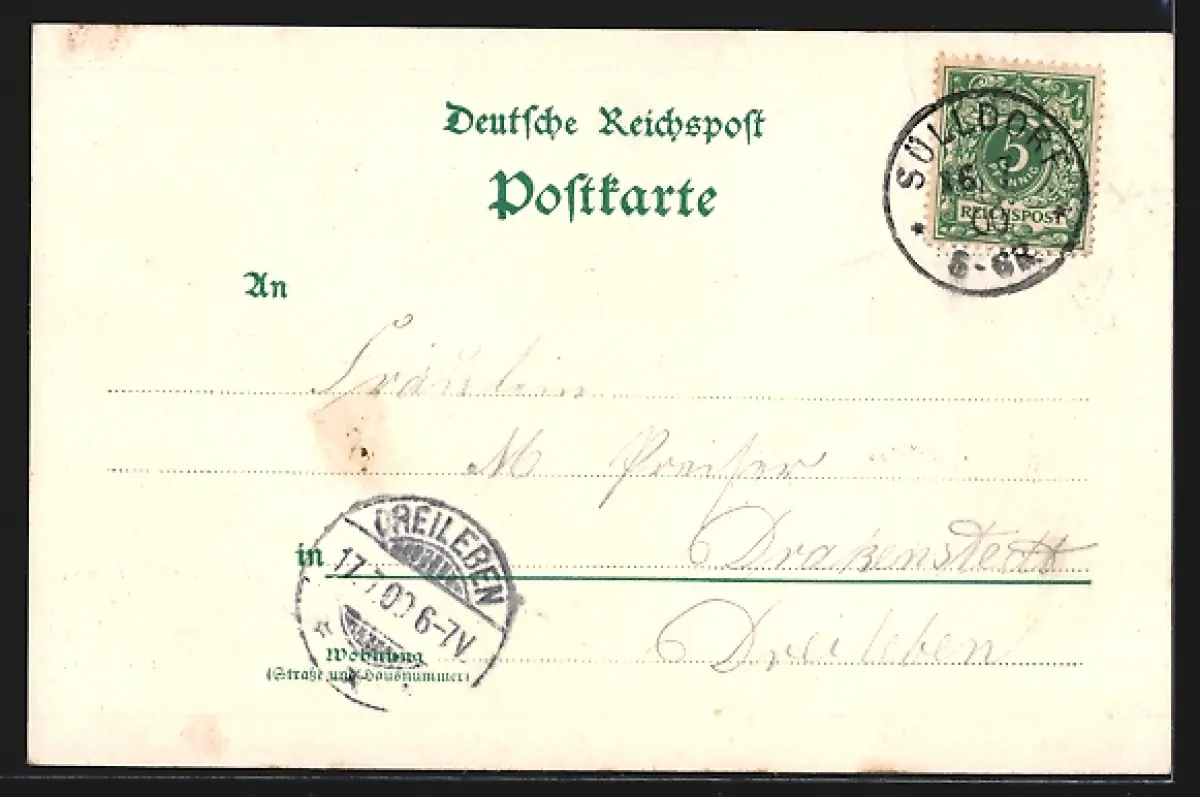 Personenbezogene Daten auf der Rückseite der Karte wurden durch blauen Textmarker unkenntlich gemacht. Die blauen Stellen sind auf die Vorderseite durchgeweicht und wirken sich negativ auf das Postkartenfoto aus