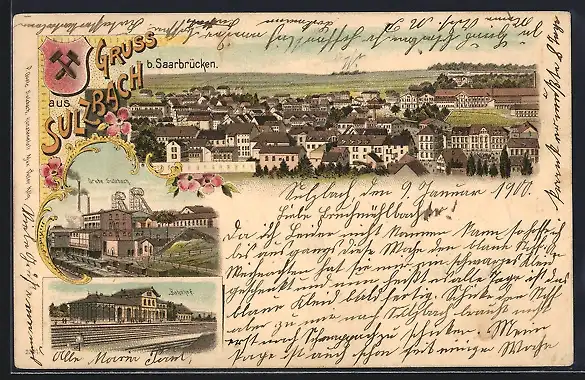 Lithographie Sulzbach / Saar, Grube Sulzbach, Bahnhof, Ortsansicht
