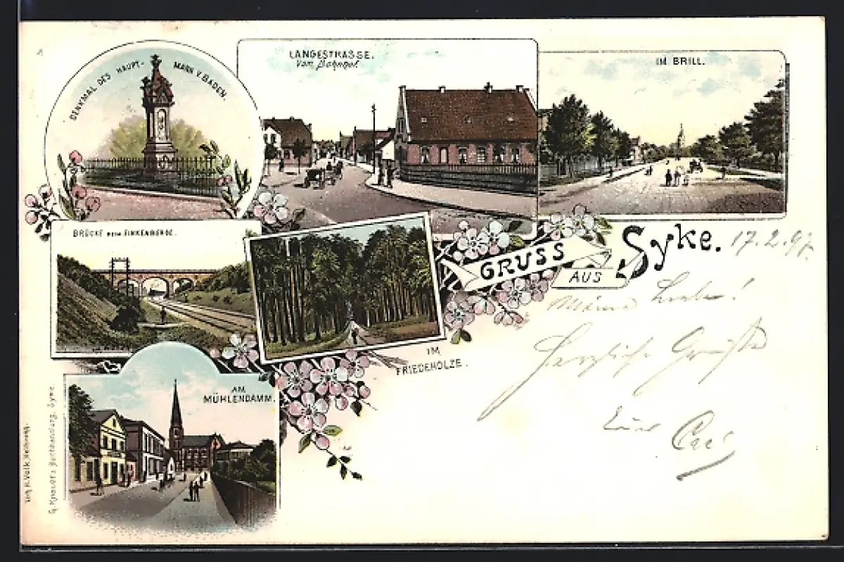 Lithographie Syke, Blick in die Langestrasse, Strassenpartie am Mühlendamm, Im Brill