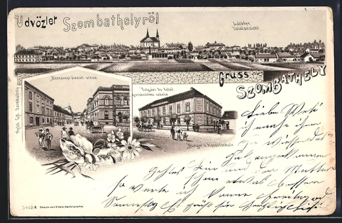 Lithographie Szombathely, Panorama, Handelsschule, Strassenansicht