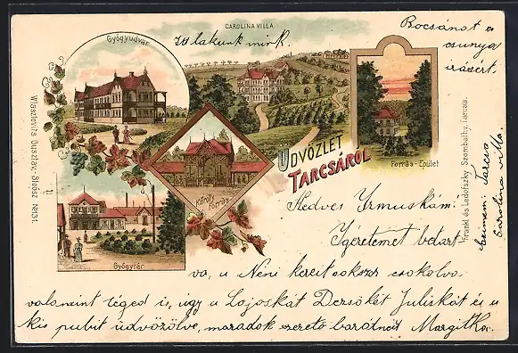 Lithographie Tarcsa, Forràs-Epület, Gyógyudvar, Gyógytér, Károly Forràs, Carolina Villa