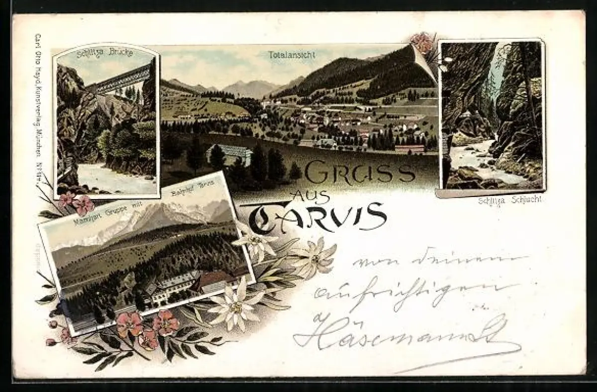 Lithographie Tarvis, Mannhart-Gruppe mit Bahnhof Tarvis, Schlitza-Brücke, Schlitza-Schlucht, Totalansicht des Ortes