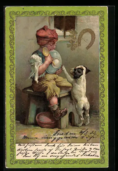 Lithographie Teller ableckender Knabe mit bettelndem Hundewelpen
