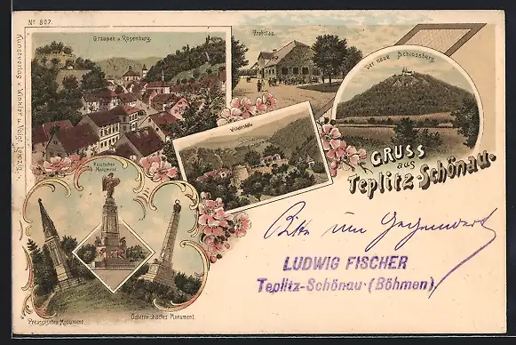 Lithographie Teplitz Schönau / Teplice, Russisches Monument, Wilhelmshöhe, Probstau, Schlossberg