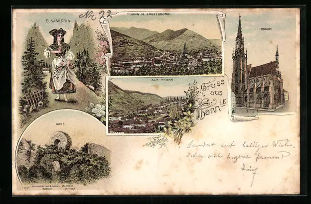 Lithographie Thann i. E., Kirche, Burg, Elsässerin in Tracht