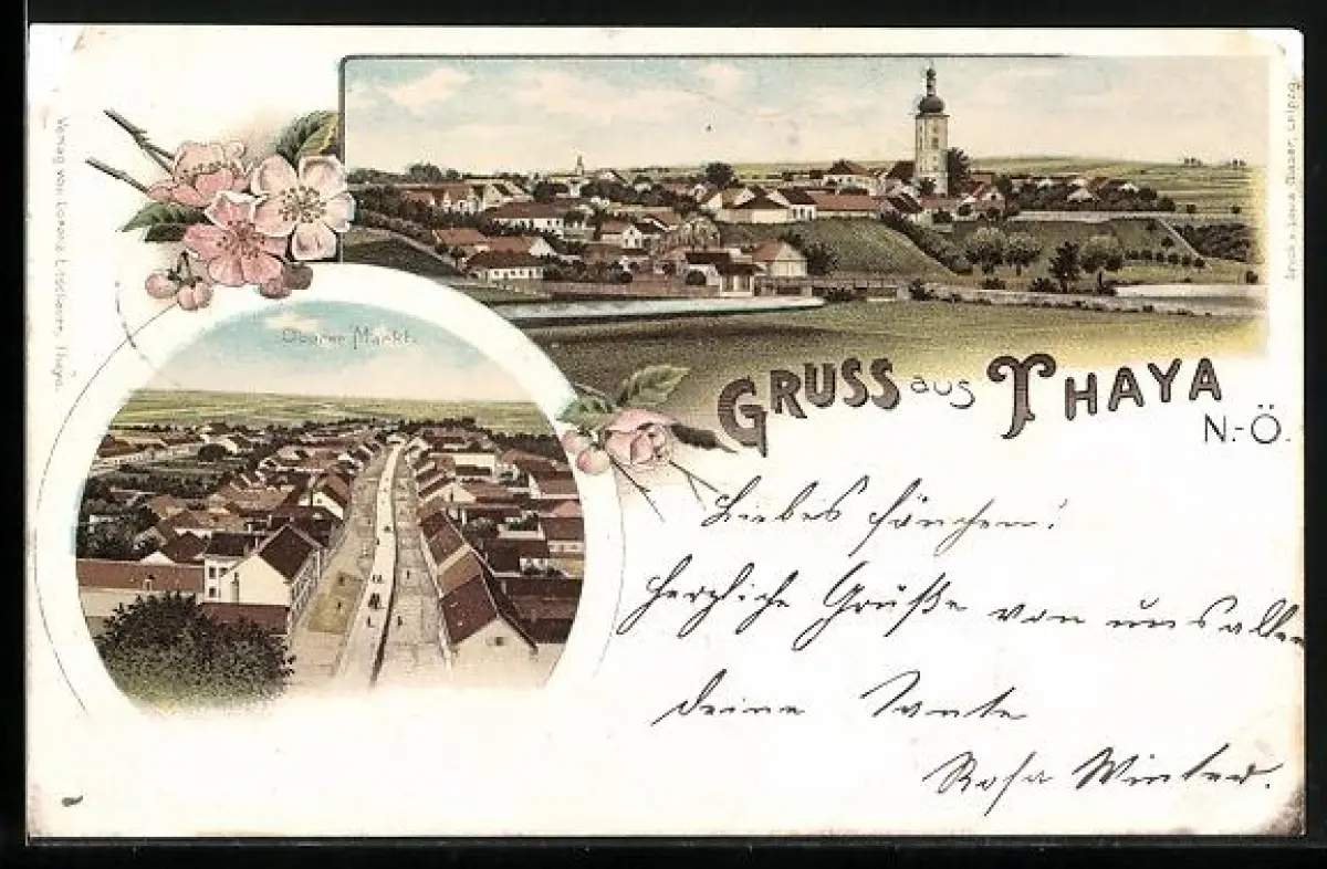 Lithographie Thaya, Ortsansicht von oben, Oberer Markt, Blumen, Strassenpartie