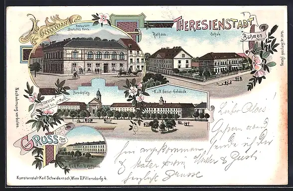 Lithographie Theresienstadt / Terezin, Rathaus und Schule, Paradeplatz mit K. u. K. Genie-Gebäude
